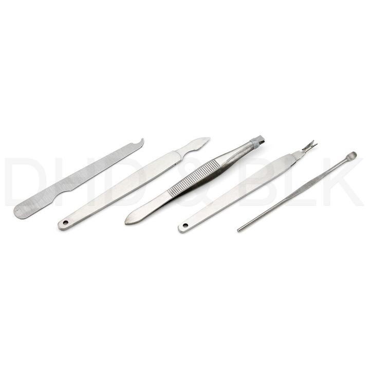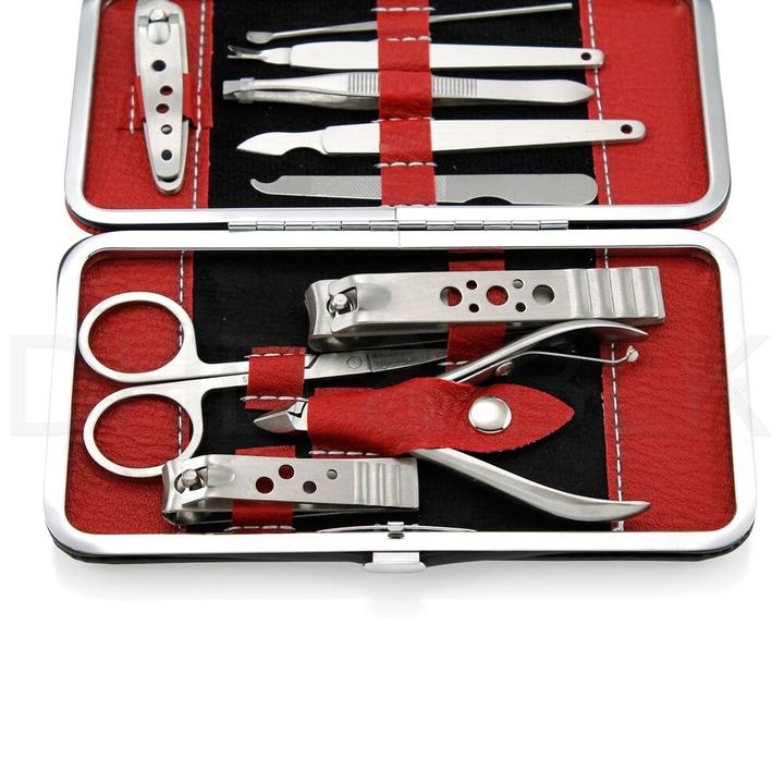 1. Includes: 1 large nail clipper, 1 small nail clipper, 1 pair of tweezers, 1 pair of nail scissors, 1 cuticle pusher, 1 nail file, 1 nail cleaner, 1 cuticle trimmer, 1 ear cleaner, 1 cuticle knife